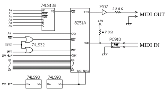 次にMZ-80用MIDIインタフェースボードについて。言うまでもなくMIDIは電子楽器をコントロールするための世界共通プロトコル(通信規約)です。最小データ単位は8bitで、31,250bps(3,125Byte/s)の非同期シリアル通信です。要はこれを実現できるインタフェースボードを作れば良いわけです。